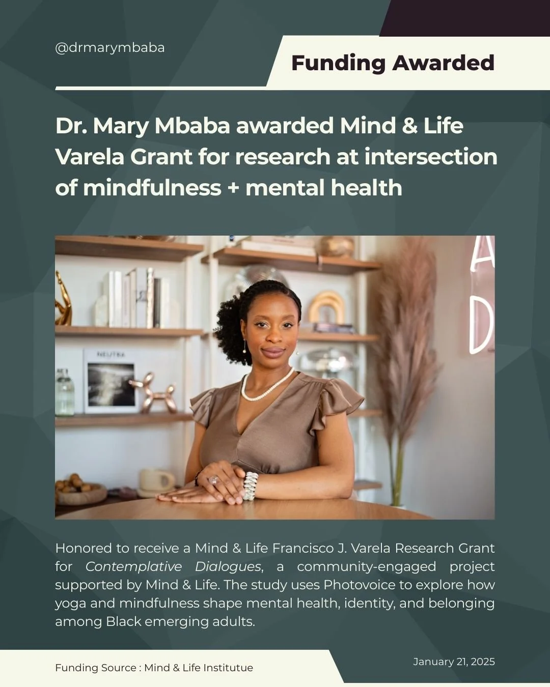 I’m honored to be a recipient of the 2025 Francisco J. Varela Research Grant for Contemplative Dialogues: A Photovoice Exploration of Mental Health through Yoga, Mindfulness, Identity, and Belonging Among Black Emerging Adults. This research centers Black emerging adults (ages 18–30) and explores how culturally adapted yoga and mindfulness practices support mental wellbeing, racial identity formation, and community connection. Using Photovoice (a creative method where participants share photos and personal stories), this project amplifies participants’ voices while deepening understanding of how contemplative practices influence daily life. Findings will help inform future mental health programs, policy, and culturally relevant wellness approaches that meet the needs of diverse communities.